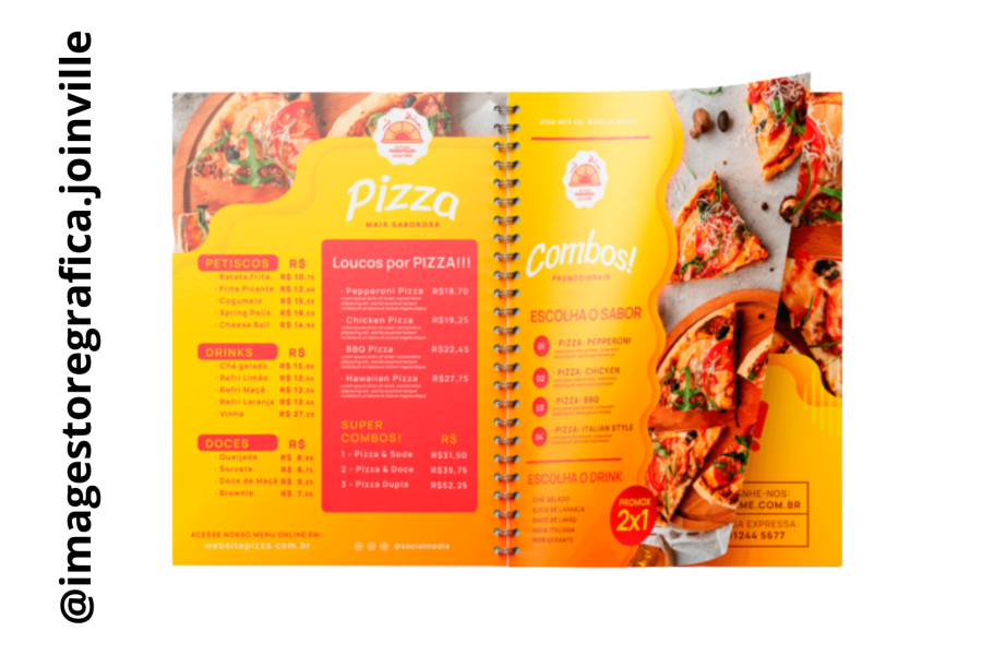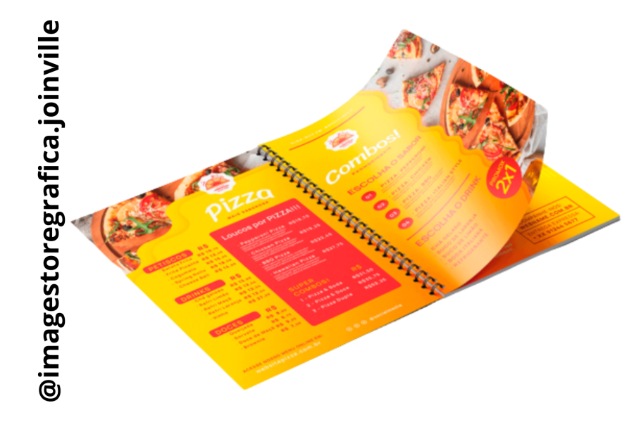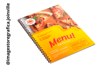 Esse modelo de cardápio é ENCADERNADO com Aspiral na cor preta ou transparente (Opcional), com a quantia miníma para compra