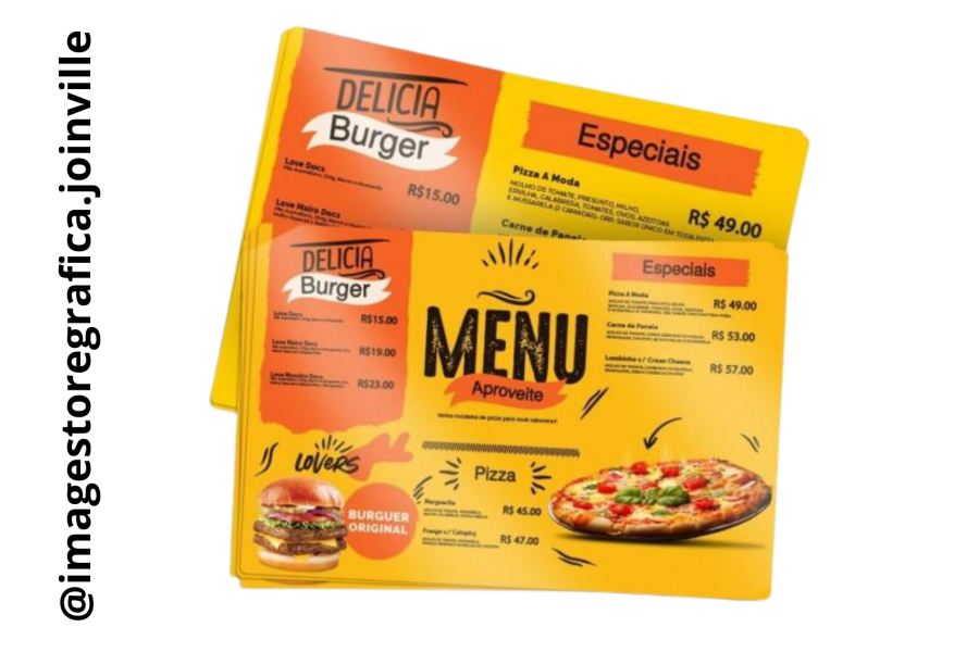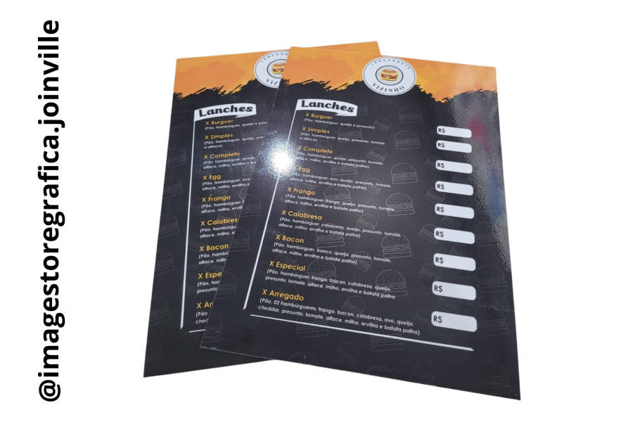 Esse modelo de cardápio é Padrão apenas uma folha(Chapa) Laminada Frente ou Frente e Verso, não possui acabamento